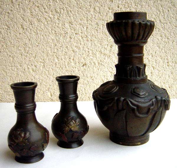 Paire de petits VASES en bronze à patine médaille à décor d'oiseaux et fleurs polychromes. Haut. 8,5 cm. Joint VASE en bronze à long col godronné et à décor de motifs géométriques. Haut. 16 cm.