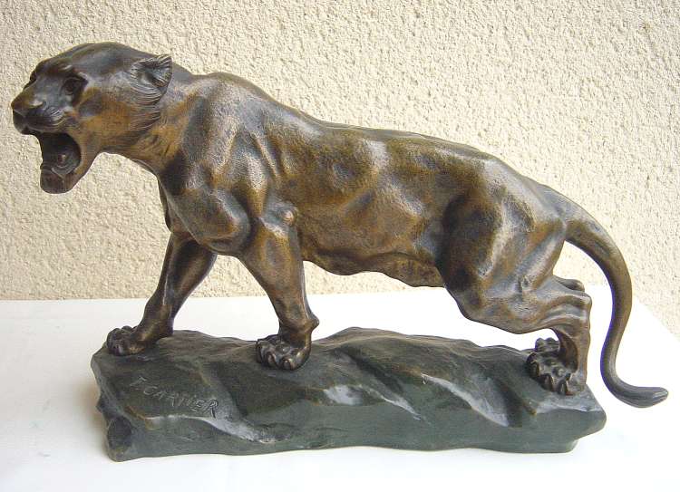 CARTIER Thomas François (1879-1943). Tigre. Bronze à patine verte et mordorée. Signé. Socle en bois. Haut. 25, Long. 37,5 cm.