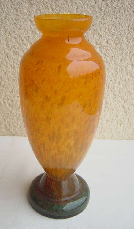 VASE bulbe sur piédouche, en verre orangé et flammé, à col évasé. Haut. 23,5 cm.