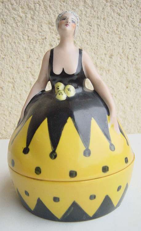 BONBONNIERE en porcelaine polychrome, sujet danseuse. Vers 1930. Haut. 14, Diam 10 cm.