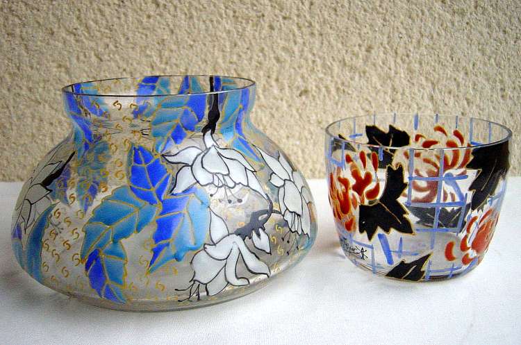 MAYOYER? Deux verreries translucides émaillées à décor floral polychrome. Vase pansu et coupe. Signées. Haut. 11 et 7,5 cm. (choc)