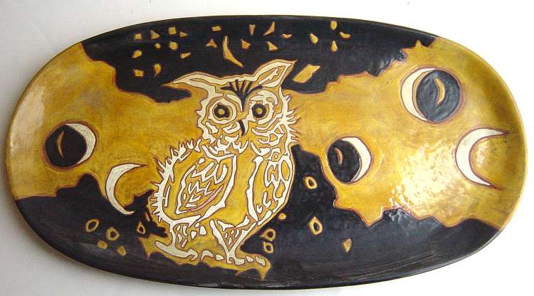LURÇAT. PLAT ovale en céramique à décor polychrome d'une chouette. Signé "J. LurçatSant-Vicens" et numéroté "19/100". Long. 54 cm.