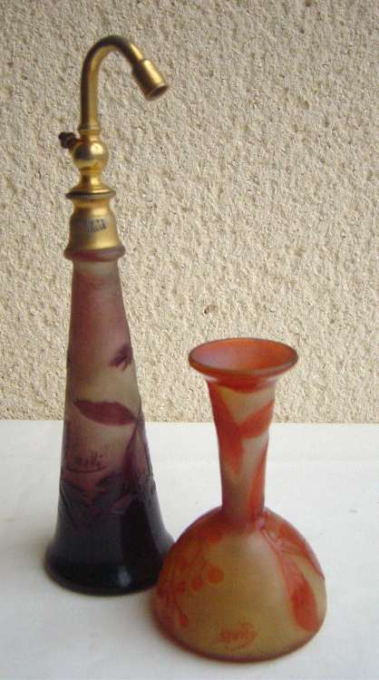 GALLÉ. VAPORISATEUR en verre à décor violet de fleurs et feuillage sur fond dépoli aux colorations changeantes, absinthe, mauve et ambre. Signature en réserve dans le décor. 21,5 cm. (accdts) Joint VASE en verre à panse et à long col-corolle à décor de rameaux orangé sur fond jaune. Signature en réserve dans le décor. Haut. 11 cm.