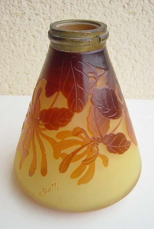 GALLÉ. VASE conique en verre, décor tombant du col de dahlia étoilé prune finement dégagé à l'acide sur un fond jaune vif opalescent. Col cerclé d'une bague de bronze. Signé. Haut. 16 cm.
