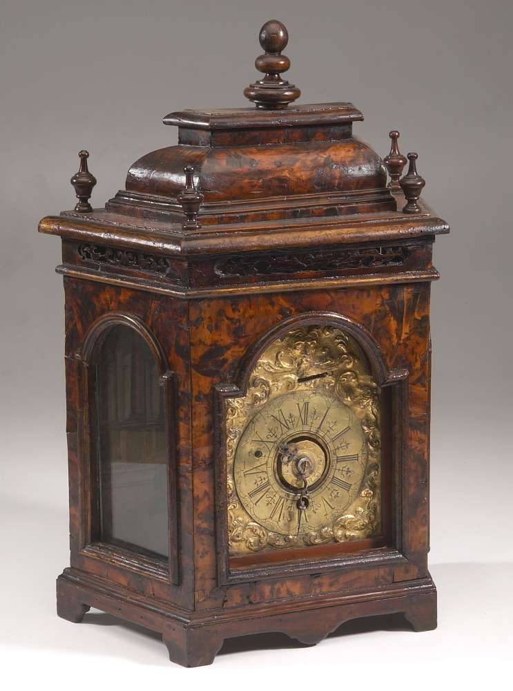 PENDULE. Caisse en bois naturel mouluré à pans. Mouvement ancien de la fin de la Renaissance faisant réveil matin en bronze doré à décor de mascarons s'apparentant à ceux d'Augsbourg. XVIIème siècle. (État de marche). Haut. 50, Long. 35, Prof. 17 cm.