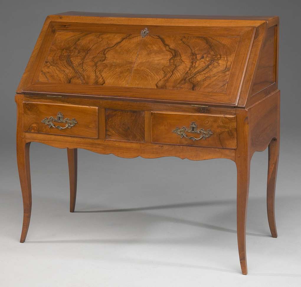 BUREAU DOS D'ÂNE, dit secrétaire en pente, en ronce de noyer. Il ouvre à un abattant dissimlant 6 petits tiroirs, des casiers et un tiroir secret, et deux tiroirs en ceinture. Piètement cambré. Ornementation en bronze: entrées de serrure et poignées de tirage. Style Louis XV. (rest. à un pied). Haut. 109, Larg. 112, Prof. 54 cm.