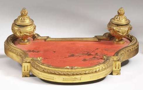 ENCRIER en bronze doré et ciselé au répertoire iconographique de la fin du XVIIIème, reposant sur une terrasse en bois laqué corail à décor de scène lacustre. Style Louis XVI, XIXème siècle.