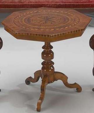 GUÉRIDON octogonal en placage de noyer. Décor de marqueterie alternant essences claires, sombres et teintées: étoiles à huit branches, rubans enroulés et figures géométriques diverses. Fût central reposant sur trois pieds sinueux. Style Charles X, XIXème siècle. Haut. 76, 75 x 75 cm.