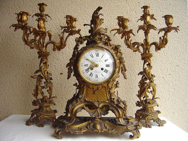GARNITURE DE CHEMINÉE trois pièces en bronze doré et ciselé, de forme mouvementée, à décor rocaille d'enroulements, feuilles d'acanthe, fleurs et volutes feuillagées, comportant: un cartel juché sur un socle feuillagé. Cadran signé "Mon Auguste Lemaire, E. Lohse Sucr, Paris, rue Vieille du Temple, 121". Haut. 56, Larg. 42, Prof. 20 cm ; paire de candélabres à six feux. Haut. 62 cm.