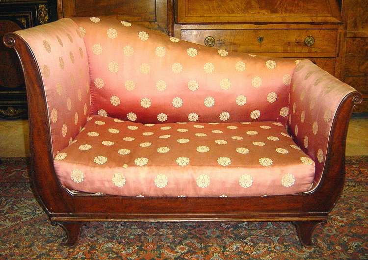 MÉRIDIENNE à dossier déclive en placage d'acajou. Deux chevets inégaux à enroulement. Piètement en volutes. Restauration, XIXème. Haut. 87, Larg. 125, Prof. 74 cm.