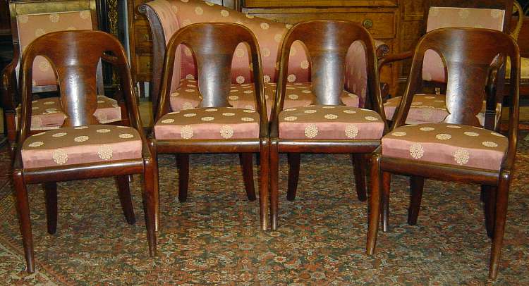 Suite de 4 CHAISES gondoles en placage d'acajou, à galette. Dossier ajouré découpé en forme de lyre. Montants latéraux courbes reliés au dossier par une ligne continue. Piètement sabre. Restauration, XIXème. Haut. 81, Larg. 48, Prof. 46 cm.
