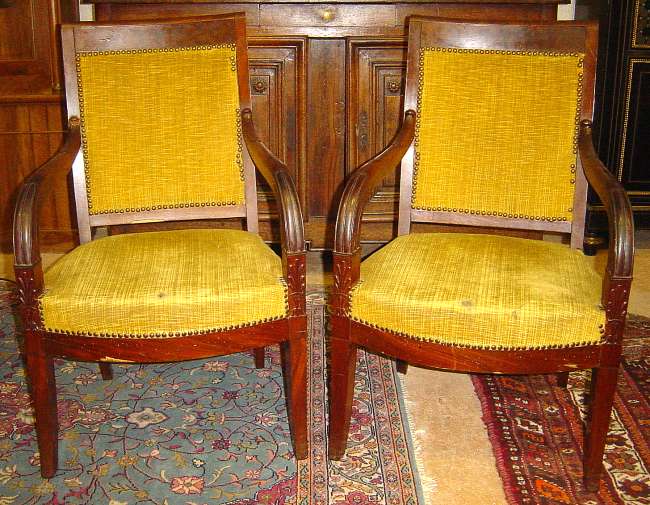 Paire de FAUTEUILS en acajou et placage d'acajou. Dossier gondole légèrement cintré. Accotoirs moulurés et sculptés de feuilles d'eau. Dés de raccordement à motifs de palmettes. Ceinture bombée. Pieds sabre. Empire, XIXème. (accdts et rest.) Haut. 92, Larg. 58, Prof. 50 cm.