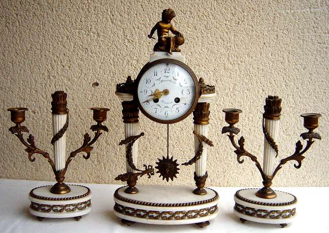 GARNITURE DE CHEMINÉE composée d'une PENDULE portique en marbre blanc à colonnes cannelées et ornementation en bronze anciennement doré au répertoire iconographique Louis XVI: guirlandes fleuries, rubans, lauriers, perles et Amour astronome. Cadran signé "Lemarchand". Haut. 41 cm. (accidents et restaurations).