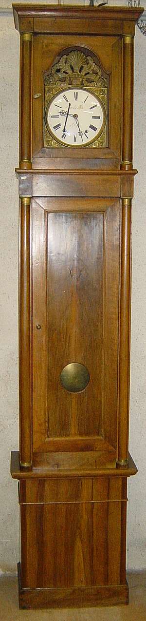 HORLOGE de parquet en bois naturel. Gaine droite à décor de demi-colonnes. Cadran orné de bouquets fleuris et cornes d 'abondance, et signé "Bailly à Dijon". XIXème. Haut. 241, Larg. 51, Prof. 28,5 cm.