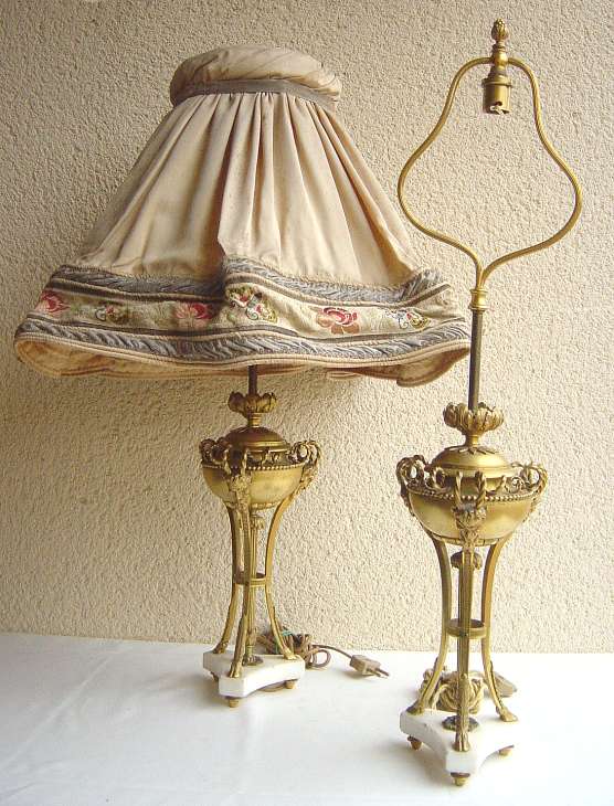 Paire de LAMPES en bronze doré en forme d'athéniennes ornées de têtes et pieds de faunes. Montées sur terrasse en marbre blanc. Style Louis XVI-Impératrice. Haut. 67 cm.