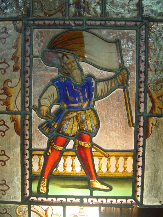 Paire de PORTES vitrées en bois naturel mouluré et sculpté de cornes d'abondance, pommes de pin et rubans. Vitraux à décor peint représentant un porte-drapeau et un hallebardier en armure dans le goût de la Renaissance. (mques) Fin XIXème-début XXème. Haut. 255, Larg. 68 cm.