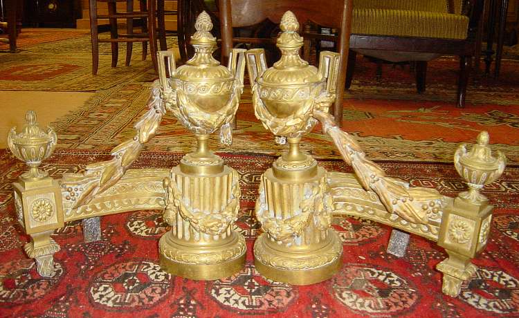 Paire de CHENETS et leurs fers en bronze doré et ciselé. Décor de vases ovoïdes couverts ornés de masques de vieillards, de frises d'entrelacs et d'urnes couvertes. Ils reposent respectivement sur