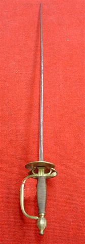 ÉPÉE DE COUR. Fusée entièrement filigranée de cuivre. Monture en cuivre doré. Pommeau à cotes. Garde à une branche, pas d'âne et quillon. Coquille bi-valve. Lame triangulaire gravée au tiers.