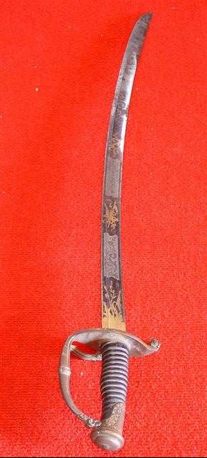 SABRE d'Officier d'Infanterie modèle 1821. Monture en laiton. Lame gravée, dorée et bleuie au 2/3. A.B.E. S.F.