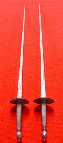 Paire de DEUX FLEURETS d'escrime. Fusées entièrement filigranées. Montures en fer. Lames triangulaires. A.B.E. XIXème siècle.