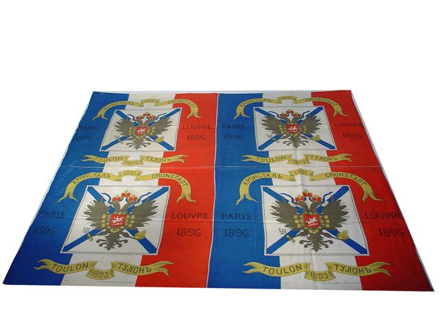 MOUCHOIRS de soldats. Pièce de tissu en coton, 92 x 82 cm, à séparer en 4 mouchoirs identiques de 45 x 40 cm. Mouchoirs aux couleurs du drapeau français, portant au centre les armes de la Russie impériale surmontant des oriflammes jaunes avec inscriptions en français et en russe "Toulon" et "Cronstadt", et datés "1891" et "1893". En marge, "Louvre, 1896".