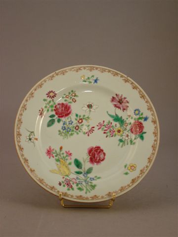 COMPAGNIE DES INDES. Assiette en porcelaine à décor de fleurs jetées dans le bassin et sur l'aile.