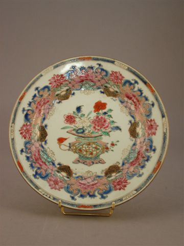 COMPAGNIE DES INDES. Paire d'assiettes en porcelaine à décor d'un pot fleuri dans le bassin et de cartouches fleuris sur l'aile.