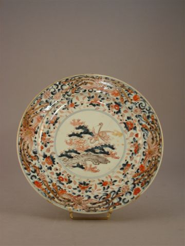 PLAT en porcelaine Imari à décor de grues dans des branchages dans le bassin et de paons sur l'aile.