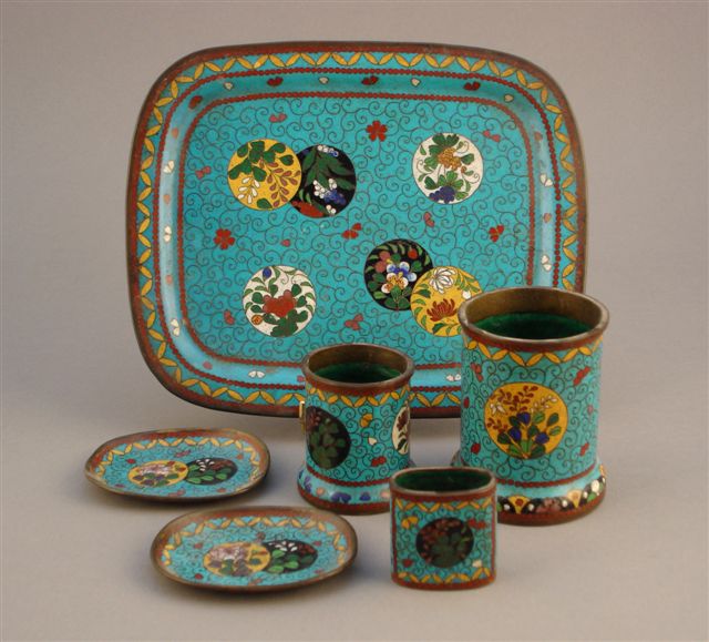 NÉCESSAIRE DE FUMEUR en bronze et émaux cloisonnés à décor de médaillons de fleurs et rinceaux sur fond bleu.