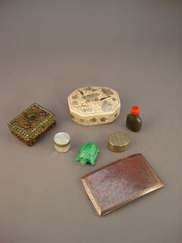 Lot de BIBELOTS divers comprenant un étui à cigarette en métal argenté ciselé de rinceaux, une boîte à pommade ornée sur le couvercle d'idéogrammes chinois, une petite tortue (malachite?), une boîte en nacre, une bouteille à opium, un coffret à bijoux et une boîte à pans coupés ornée sur le couvercle d'oiseaux peints.