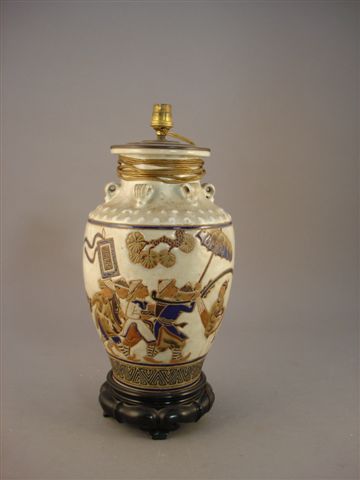 VIETNAM. VASE en céramique à décor émaillé en frise d'une procession. Base polylobée en bois noirci (accident). Haut. 38 cm. (monté pour l'électricité).