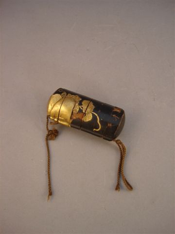 INRO à six cases en bois laqué brun rehaussé d'or à décor de fleur en relief. Cordon de soie. Japon. XIXème siècle. (accidents).