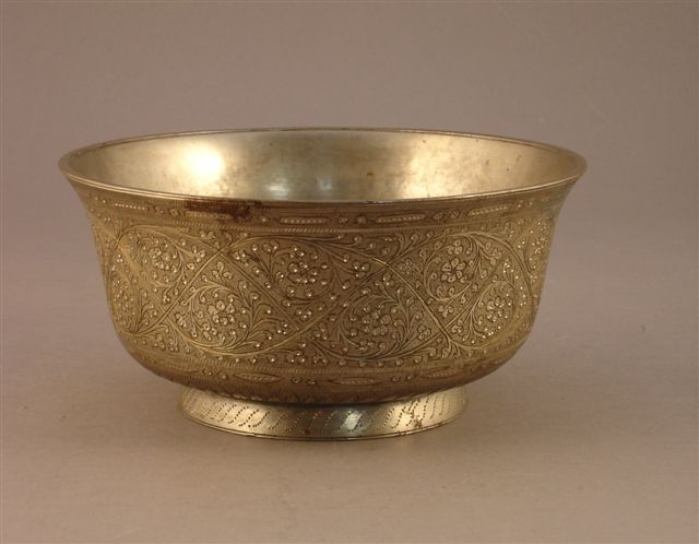 INDE. COUPE en bronze argenté repoussé d'un décor de rinceaux feuillagés et fleuris.