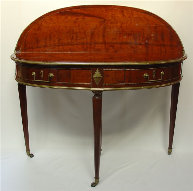 TABLE demi-lune en acajou et placage d'acajou moucheté à double plateau et à bandeau. Elle ouvre à deux tiroirs en ceinture et repose sur cinq pieds fuselés. Ornementation en bronze: moulures en demi-rond, filets d'encadrement, poignées de tirage, entrées de serrure et sabots.
