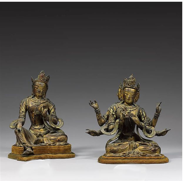 STATUETTE d'Avalokiteshvara assise en padmasana sur le lotus, les mains en vitarka mudra en bois laqué or. (manques de laque et petits accidents).