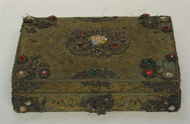 Rare COFFRET de VOYAGE de forme rectangulaire, au couvercle fermant à clef légèrement bombé. Âme de bois recouverte de tissu soyeux galonné, et brodé de rinceaux fleuris de fils jaune et d'argent ; argent filigranné de fleurs en ronde bosse rehaussées de pierres de couleurs, de plaques et coeur en porcelaine décorées d'Amours.