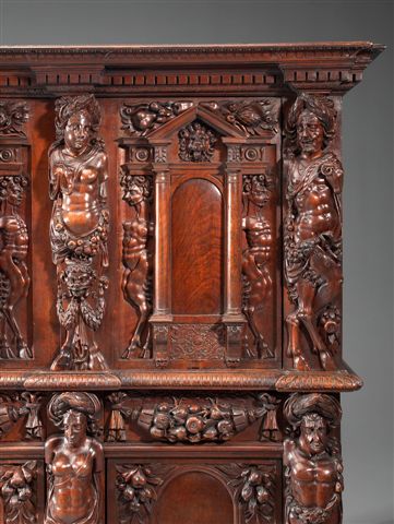 ARMOIRE à deux corps en noyer sculpté. Le corps du haut est décoré de deux arcatures à fronton à mufle de lion séparées par trois montants à figures de satyres laurés. Un décor comparable orne la partie basse: deux arcatures plus sobres sont séparées par des termes. Les entrées de serrure des deux corps sont dissimulées dans la sculpture. À la partie médiane, un rang de tiroirs est décoré de guirlandes de fruits retenues. La corniche est ornée de denticules. La base feuillagée repose sur des patins aplatis.