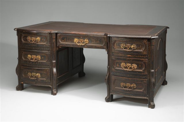 Important BUREAU PLAT DE MILIEU à caissons en bois mouluré laqué noir à décor doré de personnages et feuillages. Montants en consoles. Il ouvre à quatorze tiroirs galbés à poignées de tirages tombantes et entrées de serrure en bronze doré.