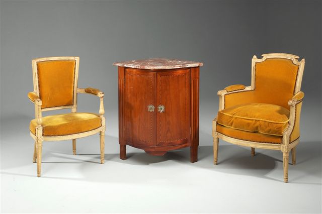 ENCOIGNURE en placage de satiné ouvrant à 2 vantaux cintrés. Décor de marqueterie en filets alternant essences claires et sombres. Montants plats à fausses cannelures marquetées. Entrées de serrure en bronze anciennement doré. Dessus de marbre brèche rouge.