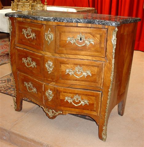 COMMODE à façade et côtés galbés en placage de bois de rose marqueté en feuilles dans des encadrements. Elle ouvre à trois rangs de tiroirs dont deux dans la partie supérieure.