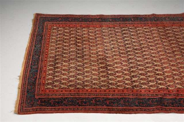 Tapis d'ORIENT, Mir, Perse. À palmettes stylisées sur fond ivoire à dominante bleu et rouge, en six contre bordures.