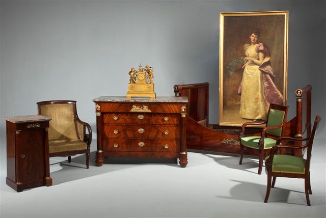 Paire de FAUTEUILS gondoles en placage d'acajou. Supports d'accotoirs aux dauphins reposant sur un dé à décor de fleurs de lotus et de feuille d'eau. Piètement sabre.
