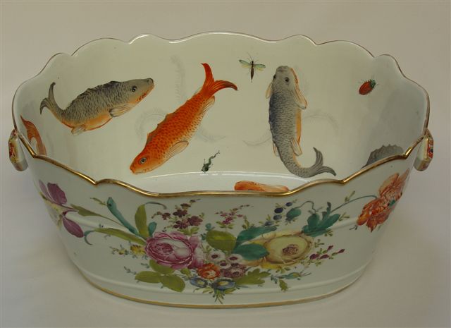 Grande VASQUE ovale à bordure chantournée. Sur le pourtour grand bouquet de fleurs polychrome orné à l'intérieur de poissons et insectes. Marqué. Fin du XIXème siècle.