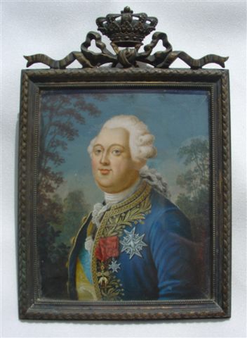 Portrait en buste du monarque en habit bleu à la française avec décorations de Saint Louis, du Saint Esprit et de la Toison d'Or.