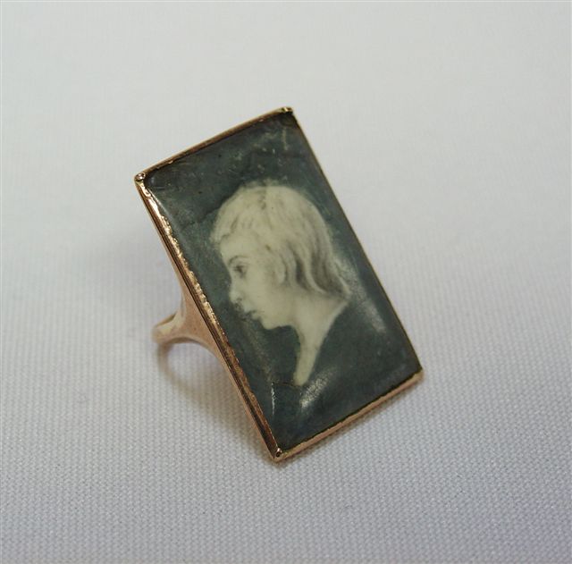 BAGUE en or, de forme rectangulaire, ornée d'un portrait présumé du Dauphin, Louis XVII. Profil gauche, cheveux longs.