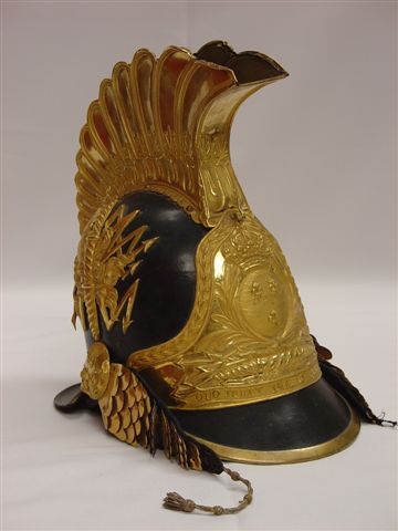 Rare CASQUE à cimier. Bombe, visière et couvre nuque en cuir noir garni sur les côtés de foudres avec éclairs. Cimier en ailes arrondies, estampé sur le masque de feuilles d'acanthes. Plaque à motif des armes de France sur foudre avec devise "QUO JUBET IRATUIS JUPITER" (c'est ainsi que Jupiter courroucé commande). Jugulaires à écailles sur velours noir. L'ensemble des garnitures en laiton estampé, découpé, doré.