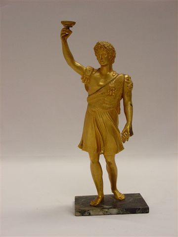 Bacchus tenant une grappe de raisin et levant une coupe. Bronze doré sur socle vert veiné. Haut. 32 cm. (accidents et restauration)