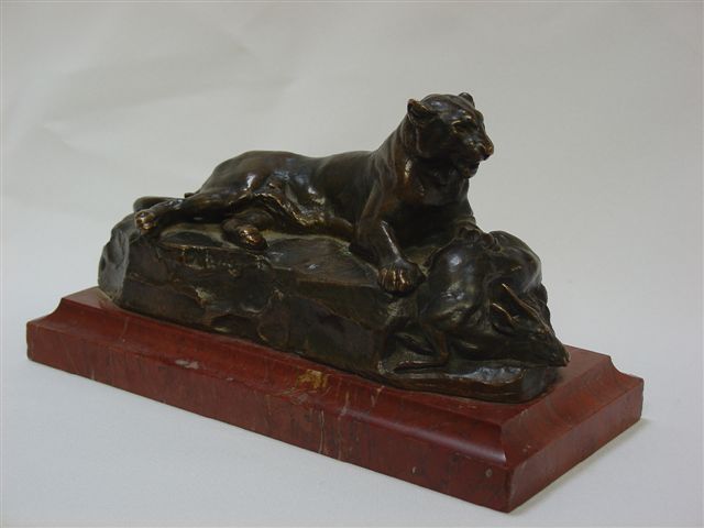 Lionne et antilope. Bronze patine brune. Signé. Socle marbre rouge. Long. 21 cm