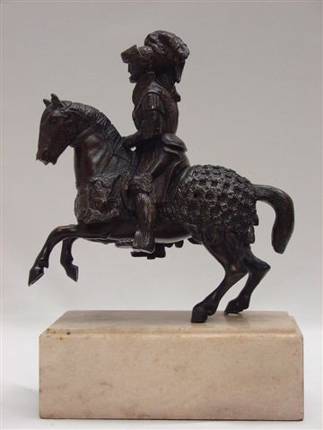 Le chevalier Bayard en cavalier caparaçonné. Bronze à patine brune. Socle en marbre rosé. Haut. 37 cm.