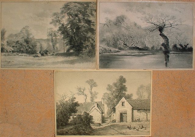 2 paysages et 1 ferme. 3 dessins au fusain. 25,5 x 36 cm.